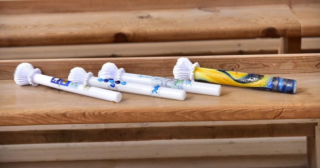 The candles are frequently offered to parents or godparents during the ceremony and become a valuable souvenir of the ceremony that symbolises the start of a spiritual journey.