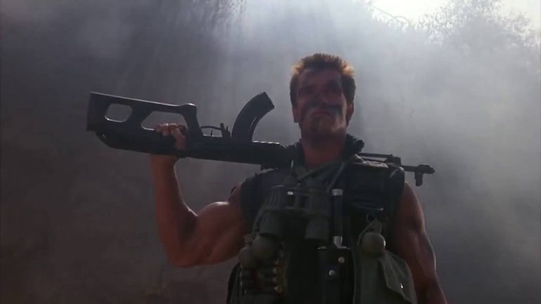 After his entire squad has been wiped out by a mysterious alien creature it’s up to Dutch (Arnie) to take him down… but he’s gotta prepare first.