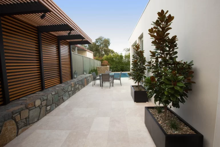 Melbourne loves outdoor dining. Lay large-format tumbled travertine on your patio. It stays cool, hides dirt well, and looks amazing with outdoor sofas and fairy lights.